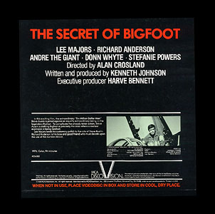 The Secret of Bigfoot is another of the two part episodes from the 1974-1978 television series The Six Million Dollar Man. It is considered to be among some of the more rare DiscoVision titles to locate. The transfer appears fuzzy at times, but this could be part of the production technique used to film it. This transfer is from 35mm film, and splices can be seen where the reels are edited together to remove the commercial breaks. It is cut slightly at the side break between Sides 2 & 3 to remove the "to be continued" closing and opening credits for the follow up broadcast, but nothing substantial is lost.