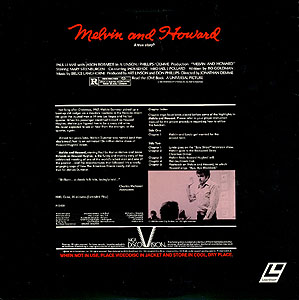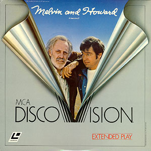 Melvin and Howard is one of the last discs to be mastered and pressed by the DiscoVision Carson facility. Most of the other DiscoVision titles of the period were manufactured by Universal Pioneer facility in Kofu Japan. The video transfer is typical DiscoVision, with too much contrast and too much brightness which creates a washed out image which can't be seen in the dark. The audio transfer isn't much better and is generally flat. The disc includes the MCA Videodisc standard "shrinking numbers" bumpers.