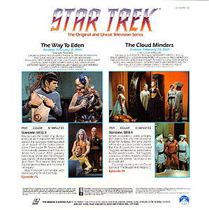 | Stardate 5832.3 Kirk pursues the stolen ship Aurora and just as it explodes he beams aboard the survivors - rebellious idealists in search of the fabled planet Eden. Their leader, Dr. Sevrin, suffers from a deadly disease which has rendered him insane. After gaining Kirk's trust, Sevrin and his followers take control of the Enterprise. Their goal: Eden. Their means: Any, including the death of Kirk and his crew, if necessary! Watch for a rare "jam" session, with Spock playing his Vulcan harp. | |