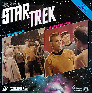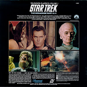 | Stardate 3012.4 This two-part episode delves into the history of the Enterprise under a different captain and crew. Mr. Spock (Leonard Nimoy) is accused of mutiny when he takes control of the Enterprise and kidnaps the former starship commander, Captain Christopher Pike (Jeffrey Hunter), who has been horribly disfigured and paralyzed in an accident. Spock sets the ship on a course for Talos IV, a planet ordered off-limits under penalty of death. He then turns himself in for court martial, leaving Captain Kirk (William Shatner) to face the possibility of sentencing his First Officer - and best friend - to death. Years before, when Pike commanded the Enterprise, the Talosians kidnapped him to strengthen their race. They used a human girl, Vina (Susan Oliver), the survivor of an earlier ship crash on the planet, to tempt him but Pike refused to cooperate, making the Talosians realize that humans were of little use to them. This is a very loose story summary, but one that was printed on the back of the jacket. This LaserDisc was issued prior to the mass release of the balance of the STAR TREK episodes, which began in 1985. | |